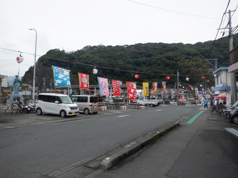 道路沿いには提灯と大漁旗が飾られ、一気に祭りの雰囲気になってきました。子ども達も、明日の大祭を心待ちにしているようです。