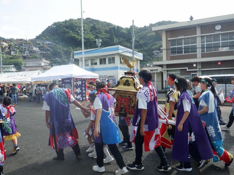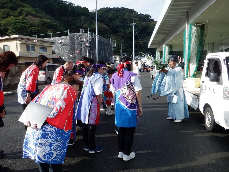 今日は子ども達が待ちに待った島野浦神社の秋季大祭。しかも5年ぶりに太鼓台が復活し、太鼓を叩く4人は早朝からメイクに着付けをしました。一足先に大人の神輿がスタートし、太鼓台以外の全員がそろったところで、水揚げ場へ移動後、神主さんにお祓いをしていただきました。いよいよ祭りが始まる、という雰囲気になってきました。