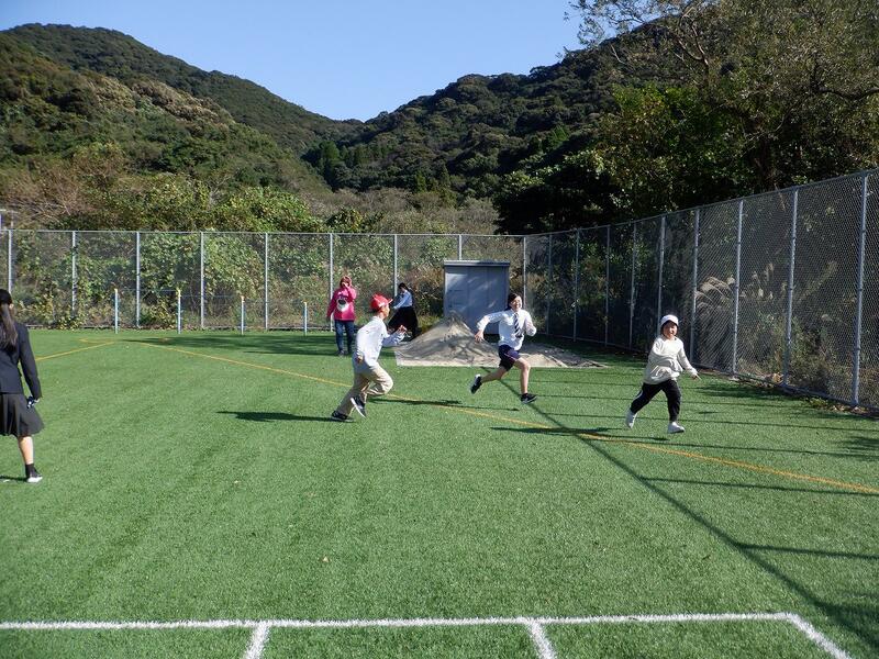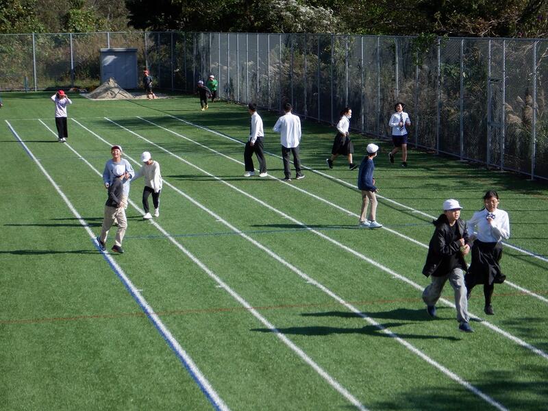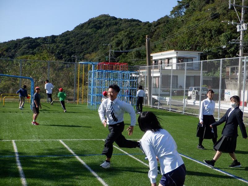 神社大祭も終わり、今日からまた通常の学校生活に戻った子ども達。が、昼休みになると全校児童生徒が運動広場へ集合。保体給食委員会の呼びかけにより、全校児童生徒で鬼ごっこをすることになったそうです。委員長さんに理由を尋ねると、12月に行われる持久走大会に向けた体力作りとのこと。2年生から9年生までが一緒になって、運動広場を所狭しと走り回る姿はまさに、義務教育学校ならではの光景でした。