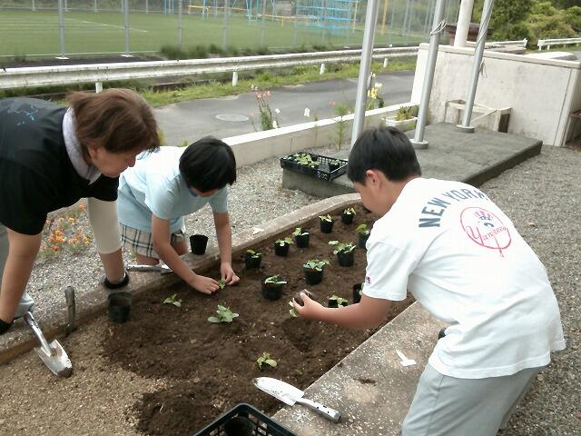 4年生は、4月にまいたヘチマの苗を花壇に植えかえました。子葉から本葉が3枚ほど出てきて、これからどんどん大きくなるはずです。最終的にはネットを張って、2階のベランダに到達するぐらい成長することを願いながら植えました。