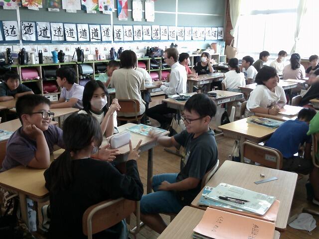 この後、3つのグループに分かれてフリートークです。高校生からは島での生活についての質問、逆に後期課程の生徒は憧れの高校生活の話に、熱心に耳を傾けていました。最後の高校生の感想の中で、「島の自然や島民の方々の優しさに触れることができ、また島に来たいです。」という言葉をいただき、改めて島のすばらしさを再確認できた子ども達でした。