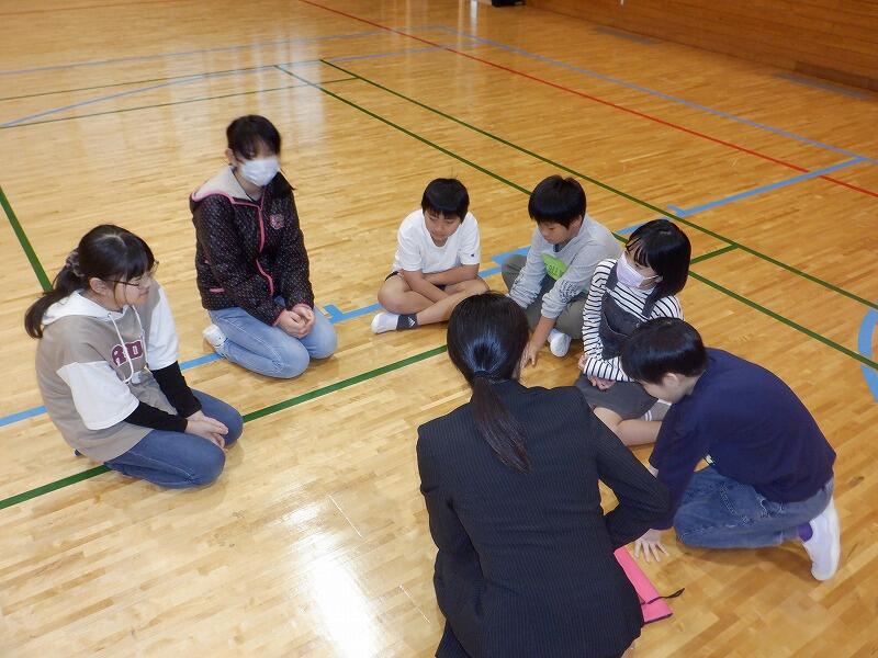 このボール遊びは、体育館内を自由に動き回り、当てられたら周りで待機。ところが、自分を当てた相手が他の人に当てられたら復活できる、というルールです。前期の子どもが果敢に後期のお兄さんお姉さんにアタックしたり、後期の生徒がゆっくり前期の子に投げてあげたり、まさに義務教育学校ならでは、の光景が見られました。もちろん同学年同士の真剣勝負や兄弟姉妹対決もあります。さらにボールが2個あるので、大忙しです。みんな汗びっしょりになって楽しんでいました。