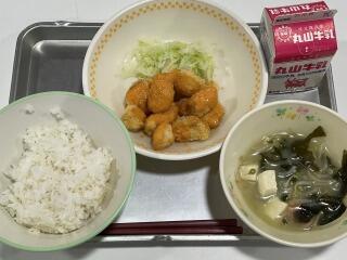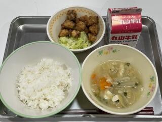 【白ご飯 牛乳 ブリ竜田揚げ ゆでキャベツ 千切大根汁】10/7