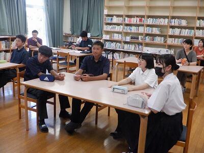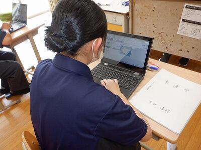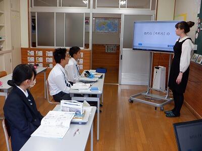 まず7年生は、ALTと英語の授業をしていました。ネイティブの発音を聞きながら、たくさんの英単語を覚えようとがんばっていました。8年生は、延岡市の取組「論理コミュニケーション」の授業です。大学の先生とオンラインで繋がり、論理的思考を高めるための学習に励んでいました。9年生は理科室で実験の授業。物が落下するときにはたらく力(重力)について、専用の器具を使い、協力しながら実験に取り組んでいました。