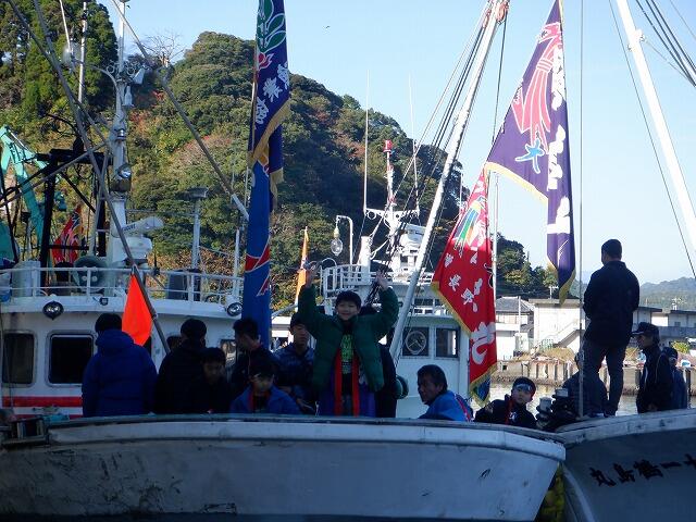 やすらぎ公園に集合し、衣装に着替えた後、水揚げ場へ。神主さんにお祓いをしていただいた後、海上パレードの船に児童生徒全員、乗せてもらいました。大漁旗をいっぱいつけた漁船が何隻も港周辺をパレードする光景は、とても壮大でした。