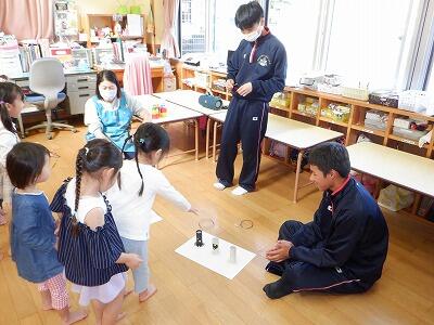 始めの自己紹介では、お互い手探り状態。その後、2つのグループに分かれて、学校で作ってきたおもちゃで遊びました。輪投げ、糸電話、ボウリングなど、全て生徒の手作りです。最初は恥ずかしそうにしていた園児たちも徐々に打ち解け、たくさんの笑顔が見られました。