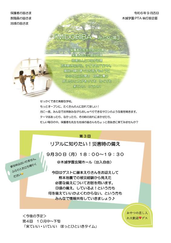 7月から月1回開催している、木城学園PTA執行部企画「MIDORIBA」ですが、第3回目を9/30(月)18:00〜19:30で木城学園エントランスホールにて行います。