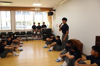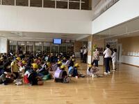 青島青少年自然の家に到着して、入所式の後にオリエンテーションが行われました。みんな真剣な表情で話を聞いていました。その後ベッドメーキングの練習をしました。