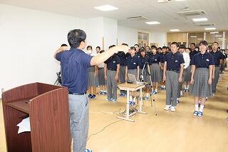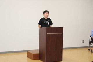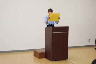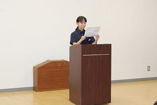 次に、運動会実行委員長の9年生「星居翔太さん」の話がありました。「自分も先輩のようにこんな舞台で輝いてみたいと思ったから」という実行委員長になった理由を述べました。そして、学園生全員に「1人1人が全力を出し、力を合わせて、記憶に残る運動会にしましょう!」という力強い言葉を2回呼びかけました。