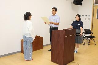 新入児氏名点呼では、1人1人元気よく返事ができました。教科書及び通学帽子授与では、2人の代表の子どもが立派な態度で受け取ることができました。