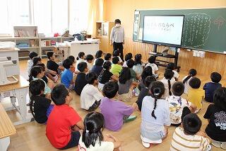 3校時、4校時に3年生に対して「木城町のホタル」についての講話がありました。3年生は、総合的な学習の時間(キータイム)に、「木城町の自然」をテーマに学習しています。その学習の一環として「M・ヒュッゲの会」の皆さんにお越し頂き、日頃行っている活動について講話をしていただきました。