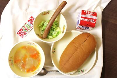 今日の献立は、ドッグパン・とり肉のスープ煮・フランクフルト・ゆでキャベツ・ケチャップです。