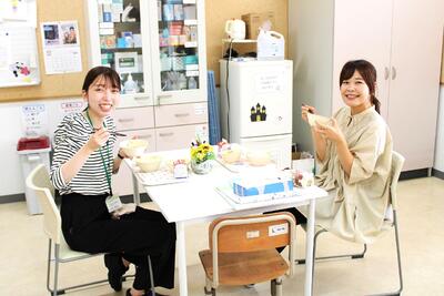 5年2組です。みんなで円になって、楽しくおいしくいただいています!