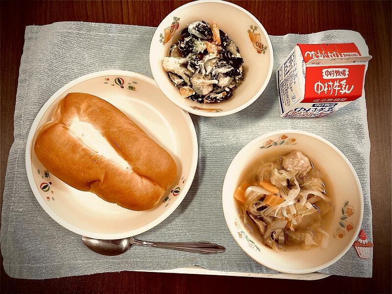 今日の給食は、牛乳、マヨネーズパン、肉団子のスープ煮、ごまドレッシングサラダでした。