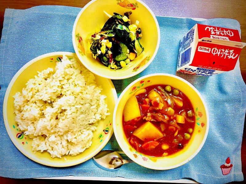 今日の給食は、牛乳、麦ご飯、ビーンズカレー、マリンサラダでした。
