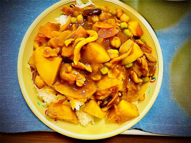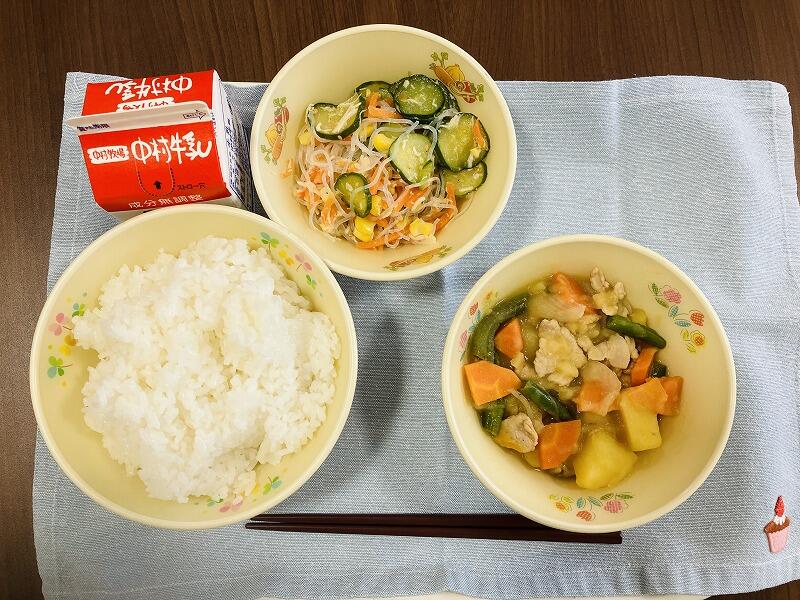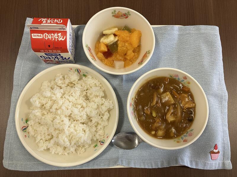 今日の給食は、牛乳、むぎごはん、チキンカレー、フルーツポンチでした。