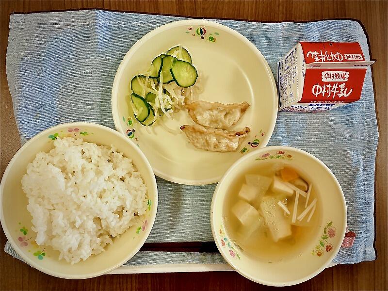 今日の給食は、牛乳、ごはん、揚げギョーザ、添え野菜、とうがんのとろとろ汁でした。