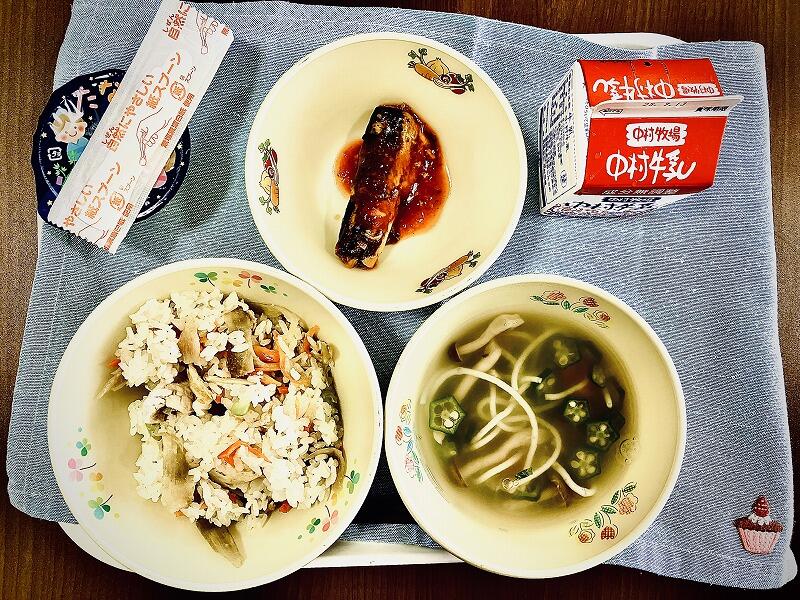 今日の給食は、牛乳、鶏ごぼうごはん、いわしトマト煮、七夕汁、七夕ゼリーでした。七夕汁には星形のにんじんや星形の模様入りのなるとが入っていており、七夕を演出していました。他の具材は、魚そうめん、しめじ、おくらでした。