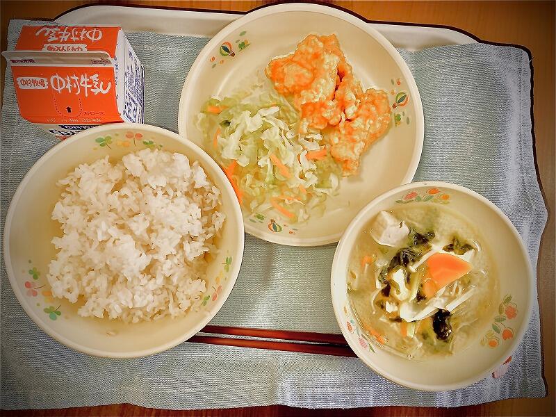 今日の給食は、牛乳、ごはん、チキン南蛮、ゆでキャベツ、大根葉のみそ汁でした。この後タルタルソースをかけて食べました。今日は7月8日で南蛮(78)の語呂合わせで「チキン南蛮」の登場でした。宮崎県の延岡市が発祥の地とされており、本県の郷土料理として有名です。