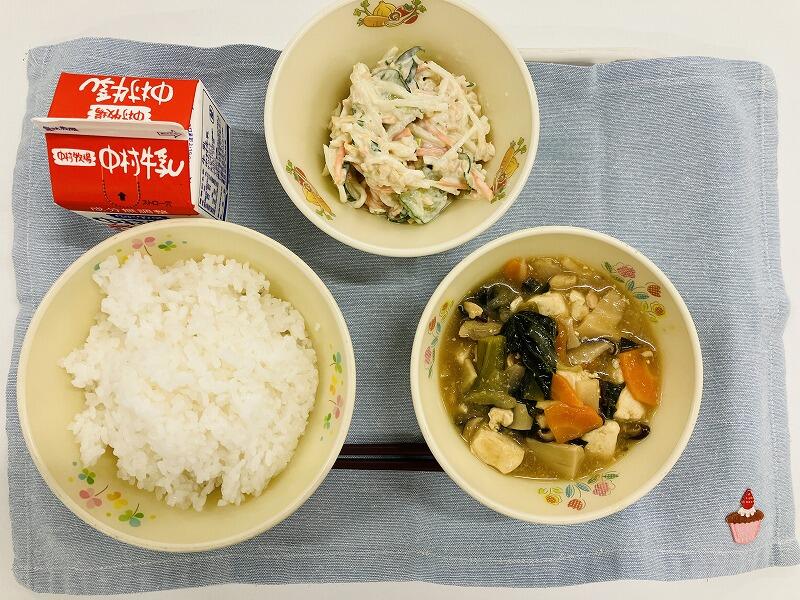今日の給食は、牛乳、ごはん、豆腐煮、納豆サラダでした。