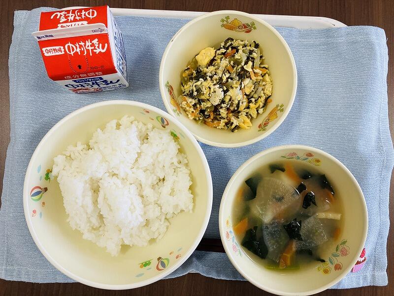 今日の給食は、牛乳、ごはん、高菜そぼろ丼、いももち汁でした。