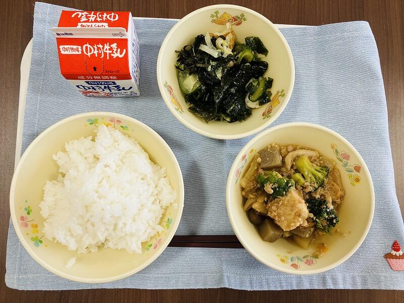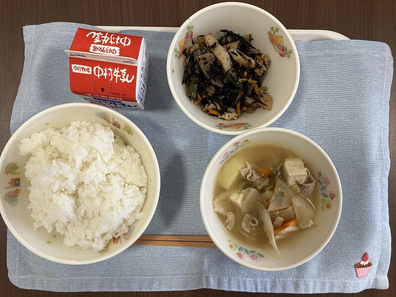 今日の給食は、牛乳、ごはん、豚汁、ひじき炒めでした。