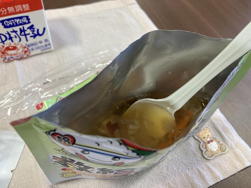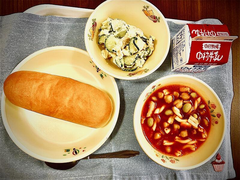 今日の給食は、牛乳、コッペパン、ミネストローネ、ポテトサラダでした。