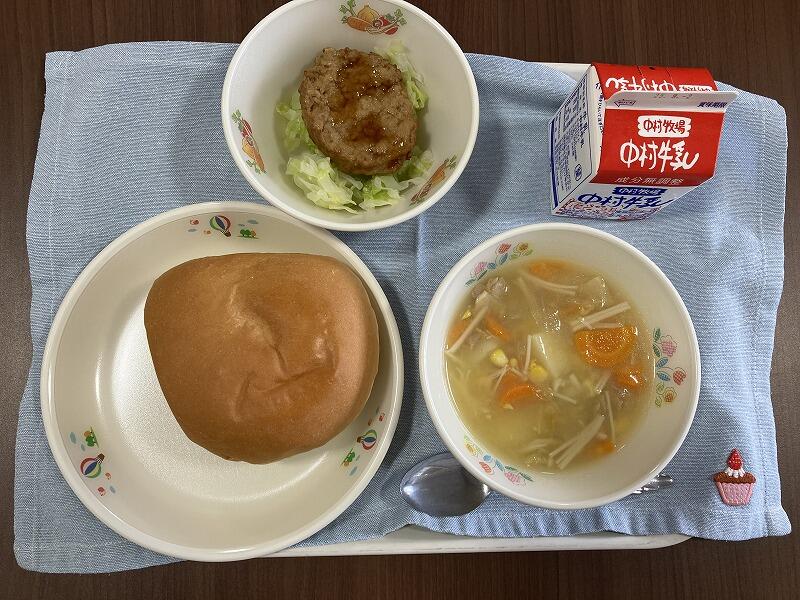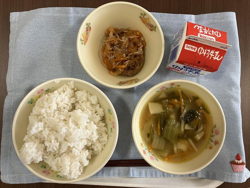 今日の給食は、牛乳、麦ご飯、ハンバーグのきのこソースかけ、茎わかめのスープでした。