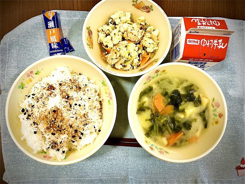 今日の給食は、牛乳、ごはん、じゃがいものみそ汁、ゴーヤチャンプルー、ふりかけでした。