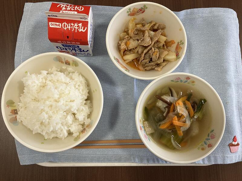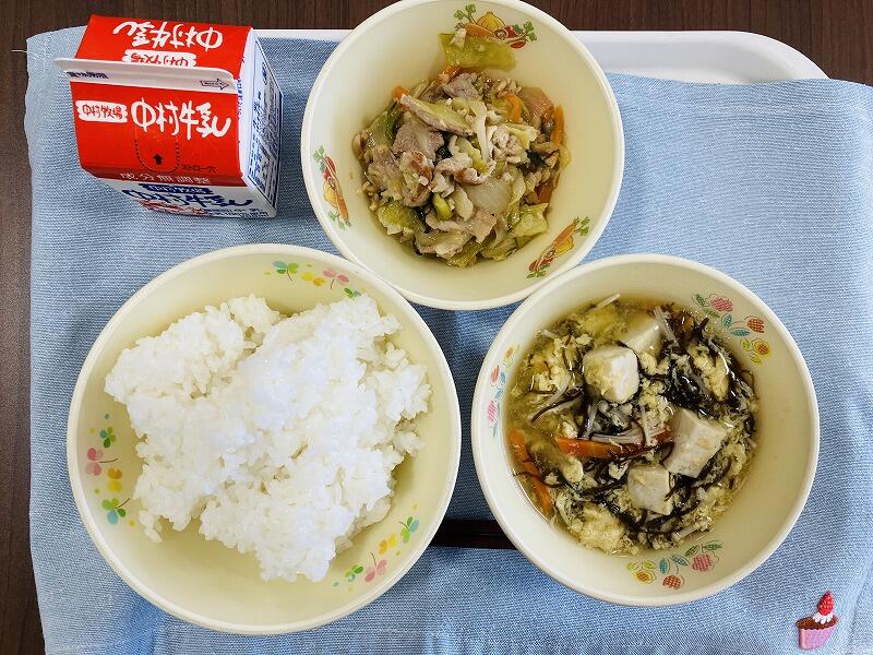今日の給食は、牛乳、ごはん、豚肉とチンゲン菜のしょうが炒め、もずくスープでした。