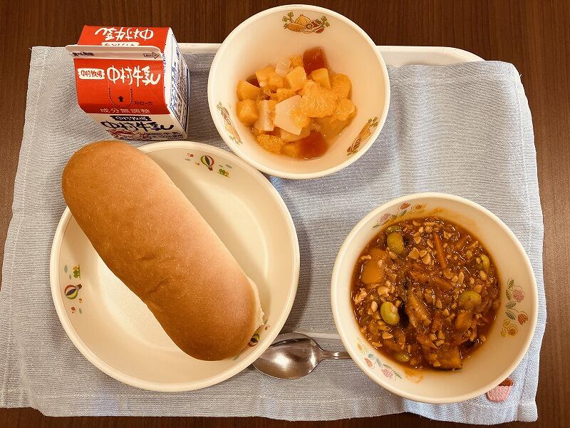 今日の給食は、牛乳、コッペパン、かぼちゃのミートソース煮、フルーツミックスでした。