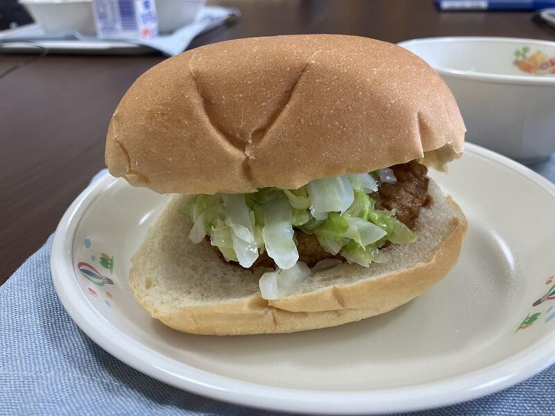 今日は始業式でした。いよいよ2学期が始まります。今日の給食は、牛乳、バーガーパン、コーンスープ、てりやきチキンパティ、キャベツでした。お好みでてりやきチキンバーガーを作ります。