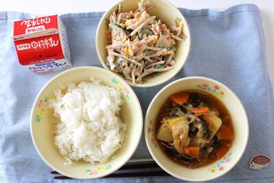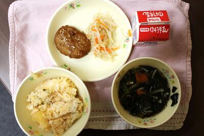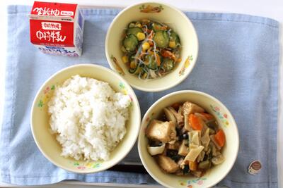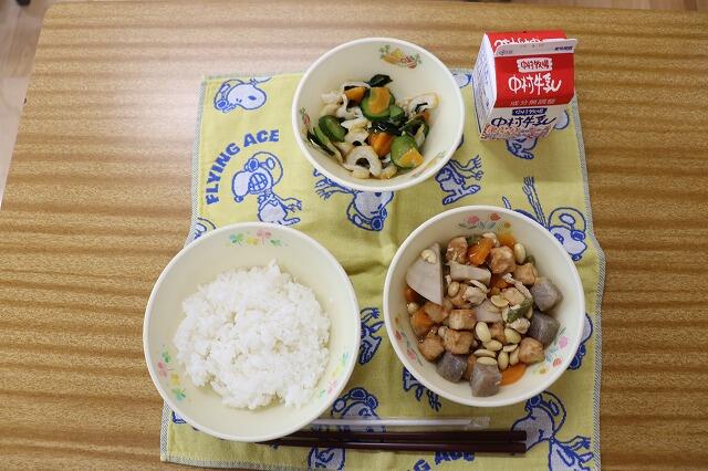 本日の給食は、牛乳、ごはん、鶏肉と大豆の煮物、ちくわときゅうりの和え物でした。