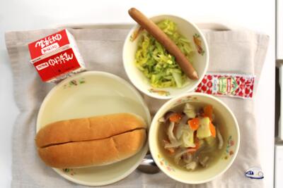 今日の献立は、ドッグパン、鶏肉のスープ煮、ウインナー、です。