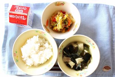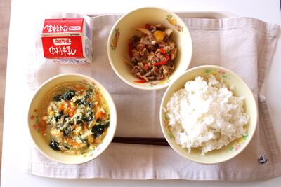 今日の献立は、ごはん、わかめスープ、肉野菜いためです。