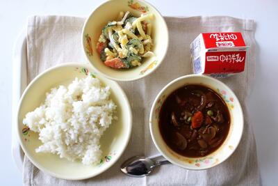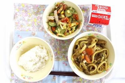 今日の献立は、ごはん、カレーうどん、りっちゃんサラダです。