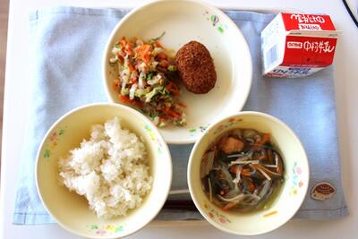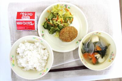 今日の献立は、ごはん、いももち汁、豆腐のミンチカツです。