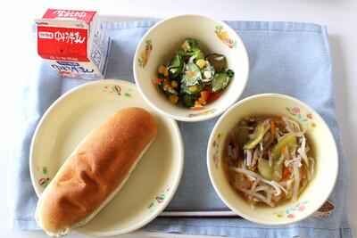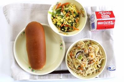 今日の献立は、減量黒糖パン、炒めビーフン、菜の花和えです。