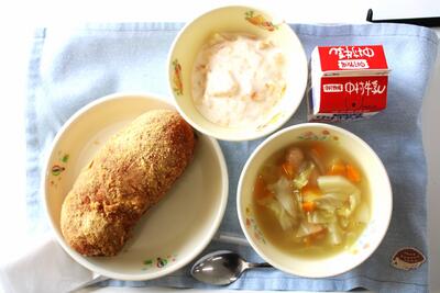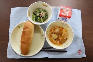 今日の献立は、揚げパン、ポトフ、フルーツヨーグルトです。