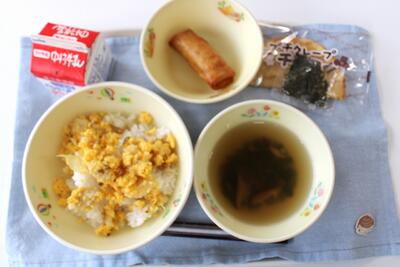 今日の献立は、麦ごはん、けいはん、揚げ春巻き、クレープです。