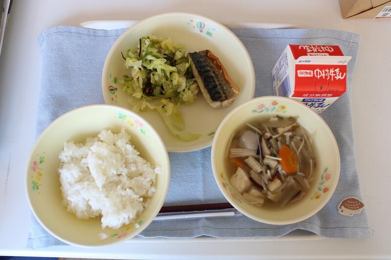今日の給食は、牛乳、ごはん、山里汁、魚の照り焼き、塩昆布和えでした。