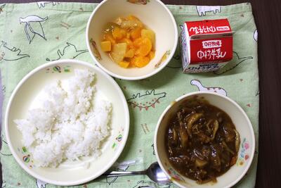 今日の献立は、麦ごはん・ポークカレー・フルーツミックスです。
