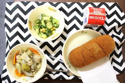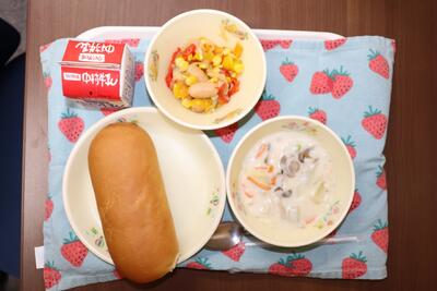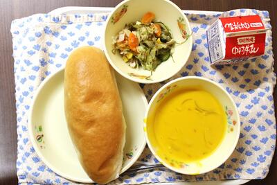 今日の献立は、米粉パン・かぼちゃのスープ・りっちゃんサラダです。