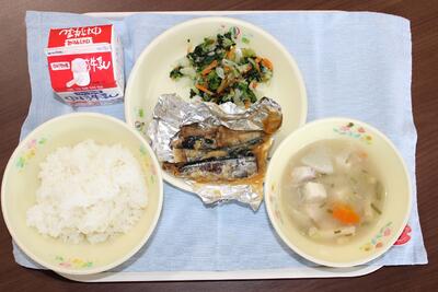 今日の献立は、ごはん・さんまのみそホイル焼き・おひたしです。