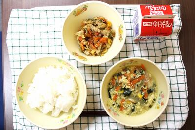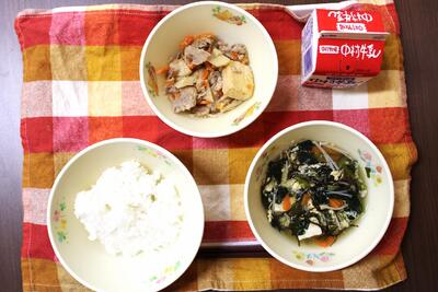 今日の献立は、ごはん・千切り大根入りみそ汁・小魚と大豆の揚げ煮です。