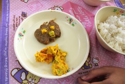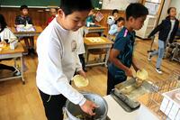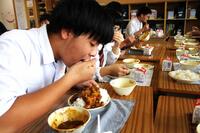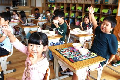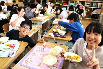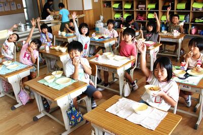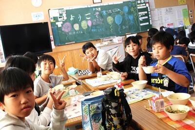 炊きたてが、ほかほかのまま教室まで届くのが、木城の給食のよいところです。