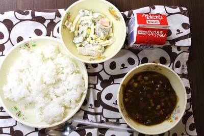 今日の献立は、麦ごはん・ビーンズカレー・マカロニサラダです。