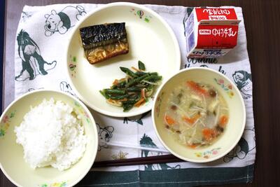 今日の献立は、ごはん・なめこのみそ汁・魚の照り焼き・いんげんのごま和えです。