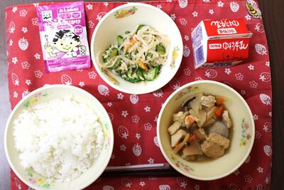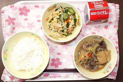 今日の献立は、ごはん・すき焼き風煮・ピーナッツなますです。