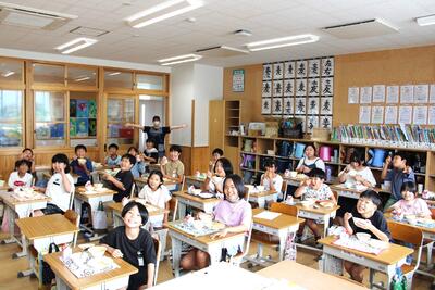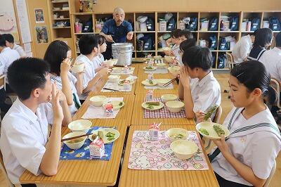 給食時間には放送で子供たちにクイズやその日に使われている食材の話をしています。